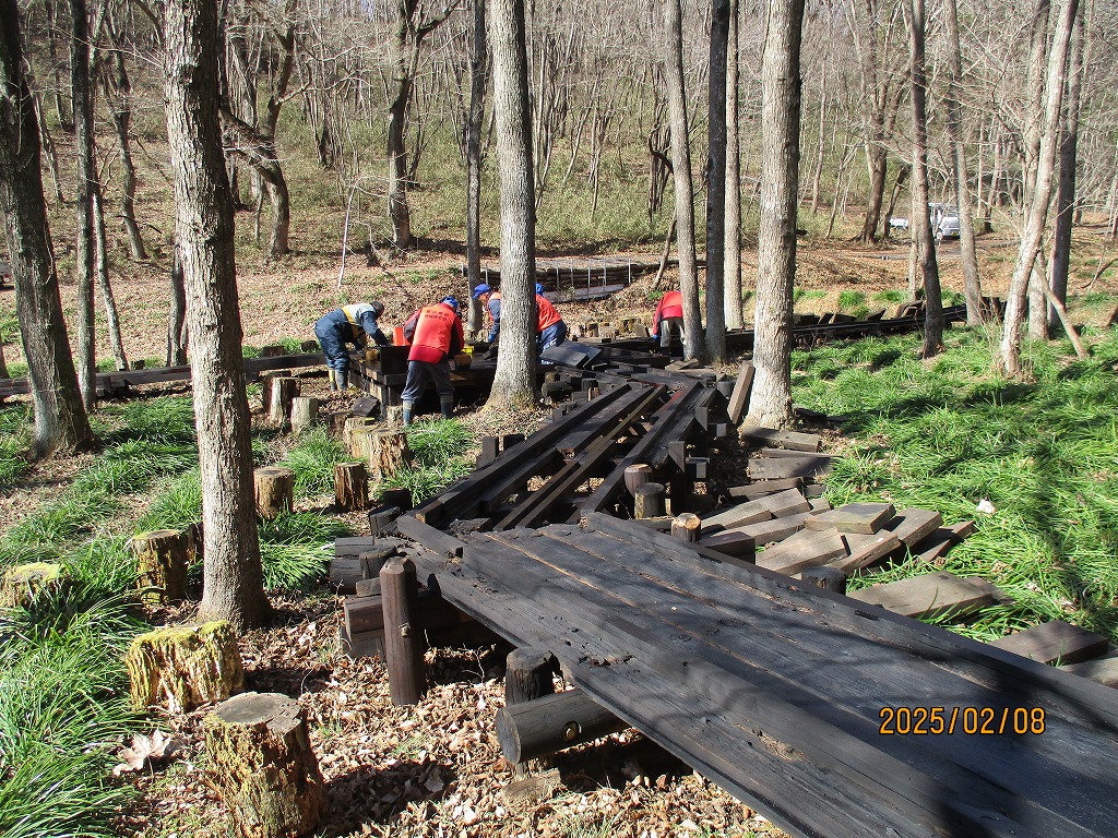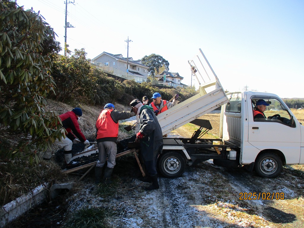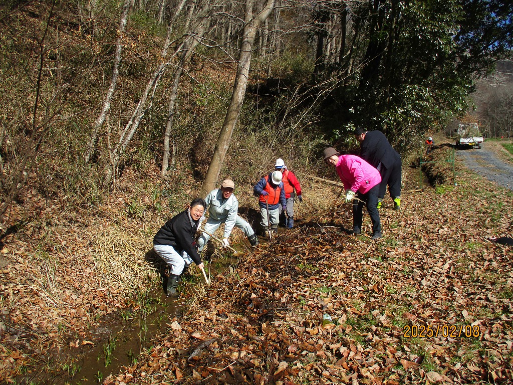 2月8日(土)午前中は、①農道等の補修、②小川(土水路)の清掃、③観察木道の防腐剤塗布を行いました。