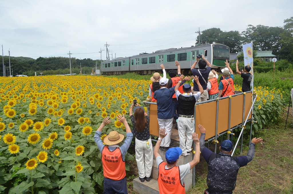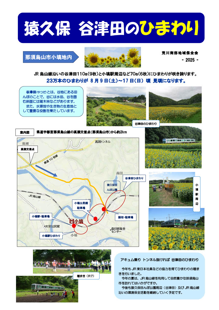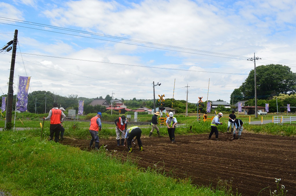 去る6月16日(月) 荒川南部地域保全会員のほかJR東日本宇都宮統括センターの職員10名など、合計39名により小塙駅や猿久保田んぼ公園(谷津田)周辺の遊休農地15箇所180a(18,000㎡)にひまわりの種を蒔きました。